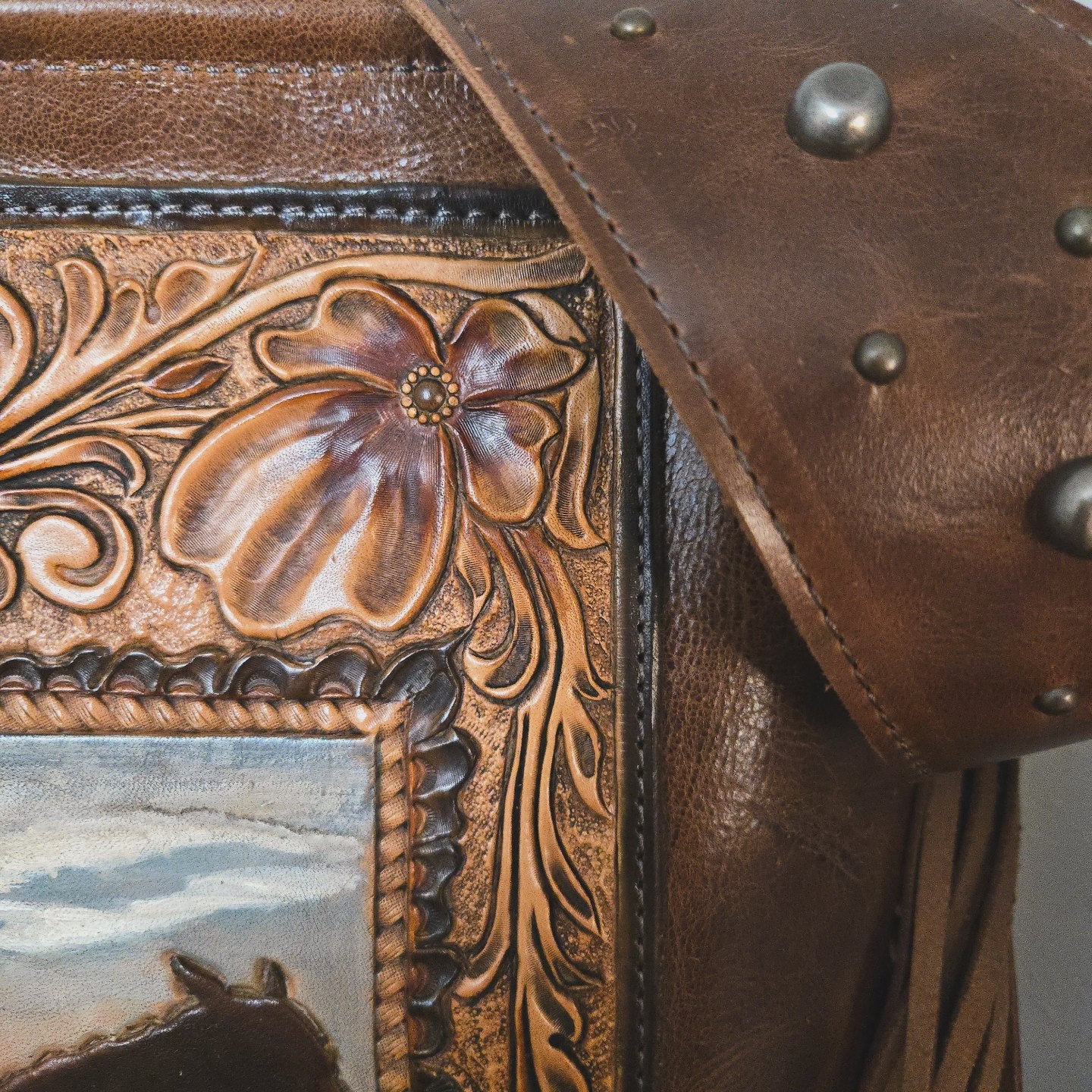 Russet pull up leather with hand tooled and painted front depicting the American Cowboy ( aka 'grandson'). Lined with coordinating embossed leather featuring one zippered pocket and one slip pocket.
