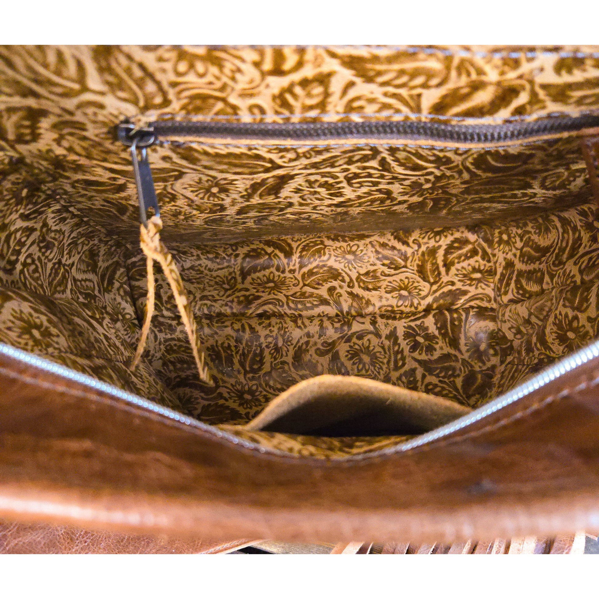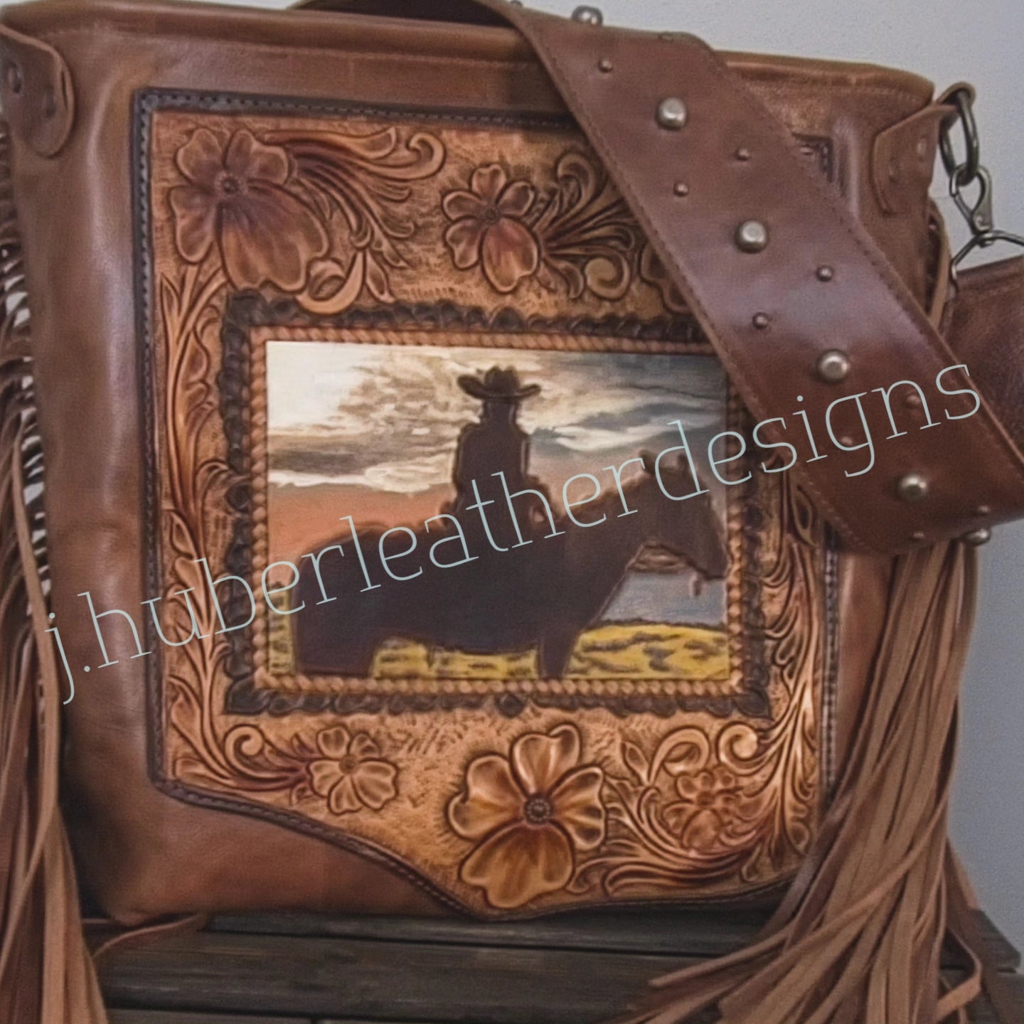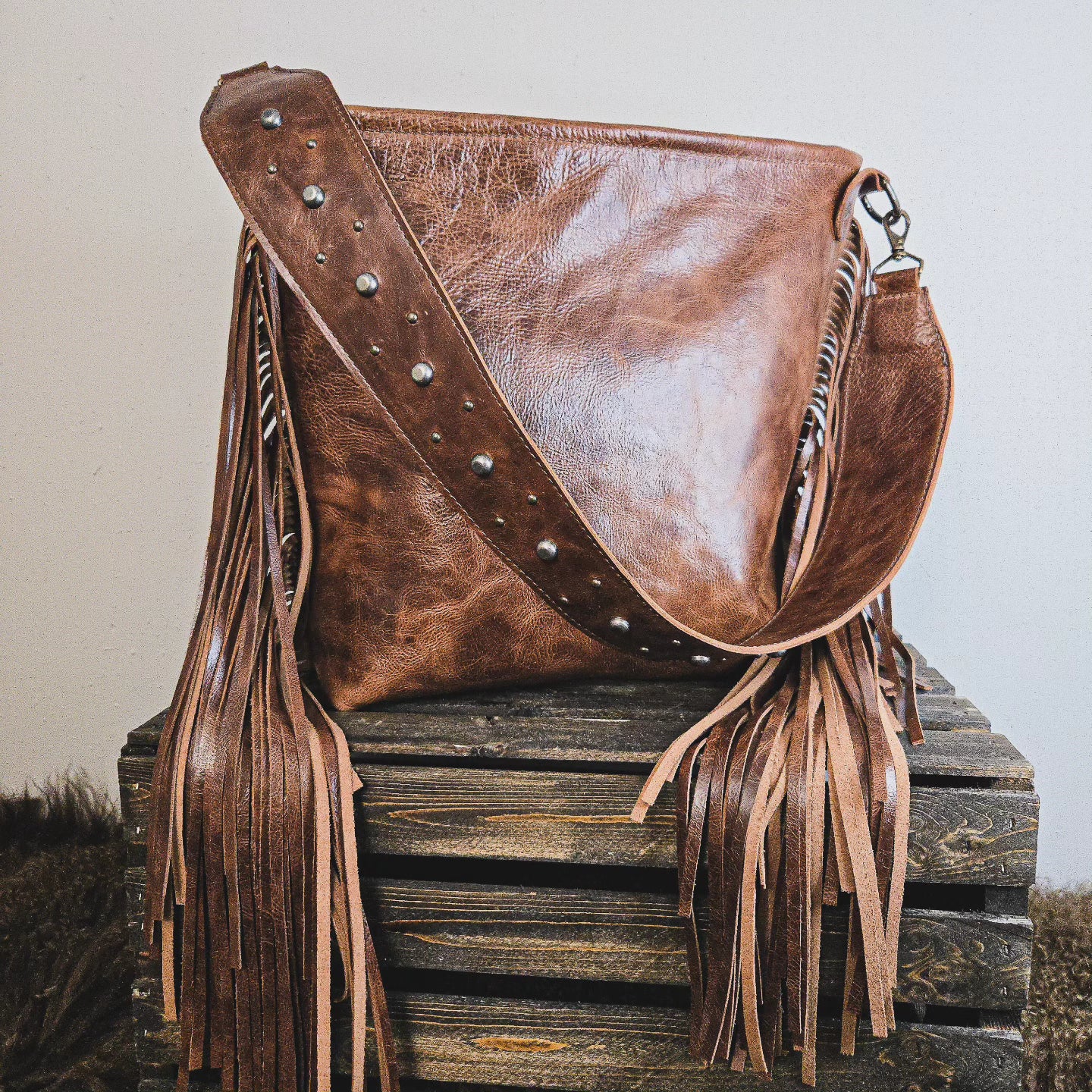Studded shoulder strap with antique brass and silver spots. 18" handcut fringe.