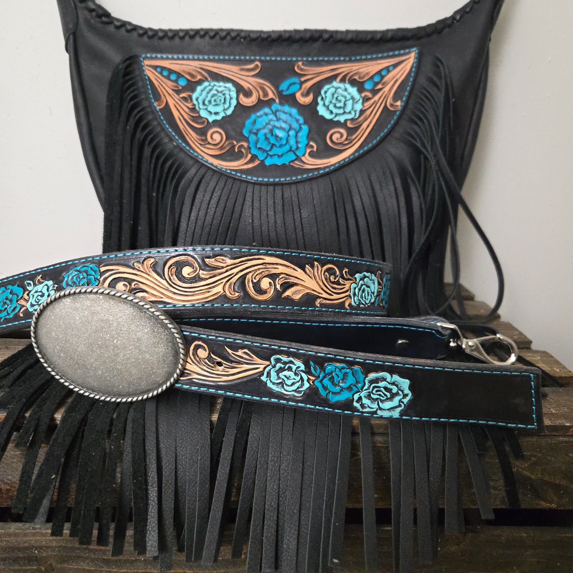Gorgeous tooled Turquoise Rose Hobo style bag with fully tooled belt style strap.