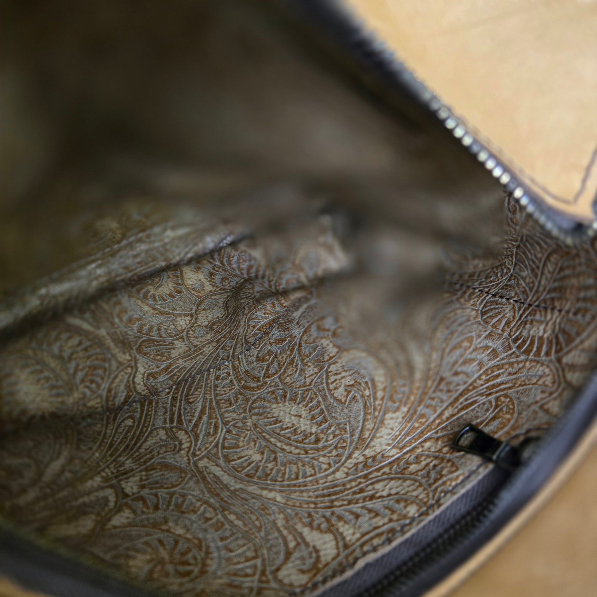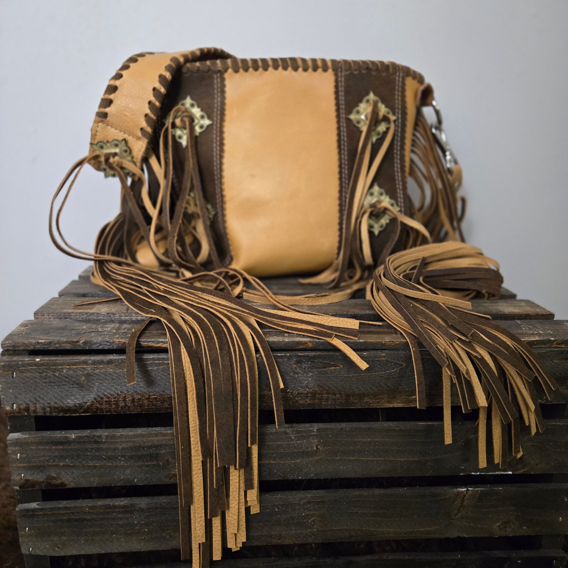Buttery soft Napa Leather in Wheat paired with Chocolate roughout leather. Lined with coordinating embossed leather.