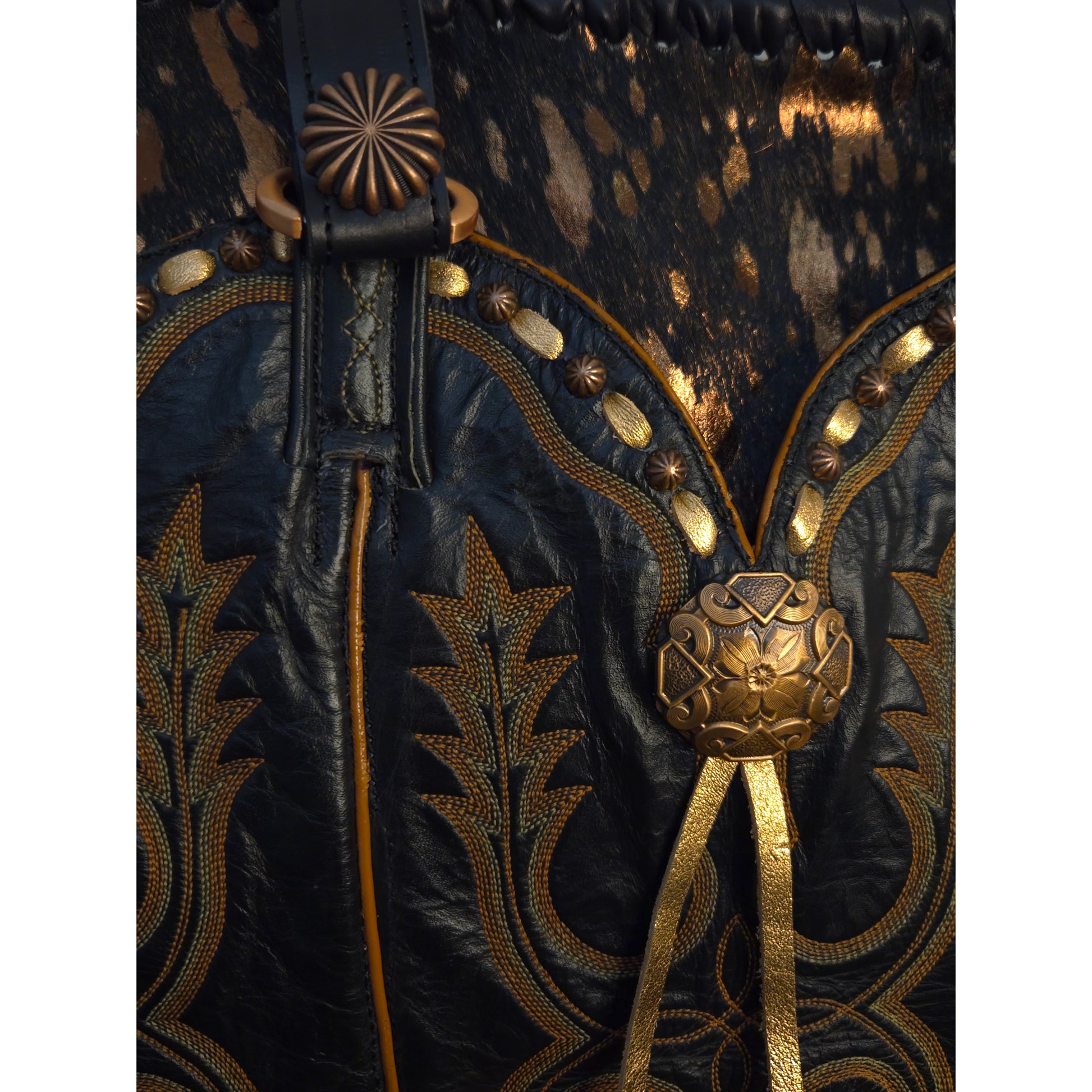 Gorgeous vintage Tony Lama Boot Top paired with Copper and black acid wash cowhide and smooth black leather. Featuring copper hardware and 18" hand cut fringe.